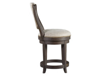 Vintage modern designs in white oak veneers and select hardwoods in a rich brown wire-brushed and cerused finish with 120 degree memory swivel. The upholstered seat and back splat have decorative nailhead trim and metal kickplate in antiqued brass finish. The upholstery is standard fabric 220211 Landen, an indoor performance fabric with a woven linen construction in soft shades of ivory and taupe. It is highly resistant to staining, will repel liquids, and allow stains to be cleaned with soap and water.