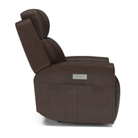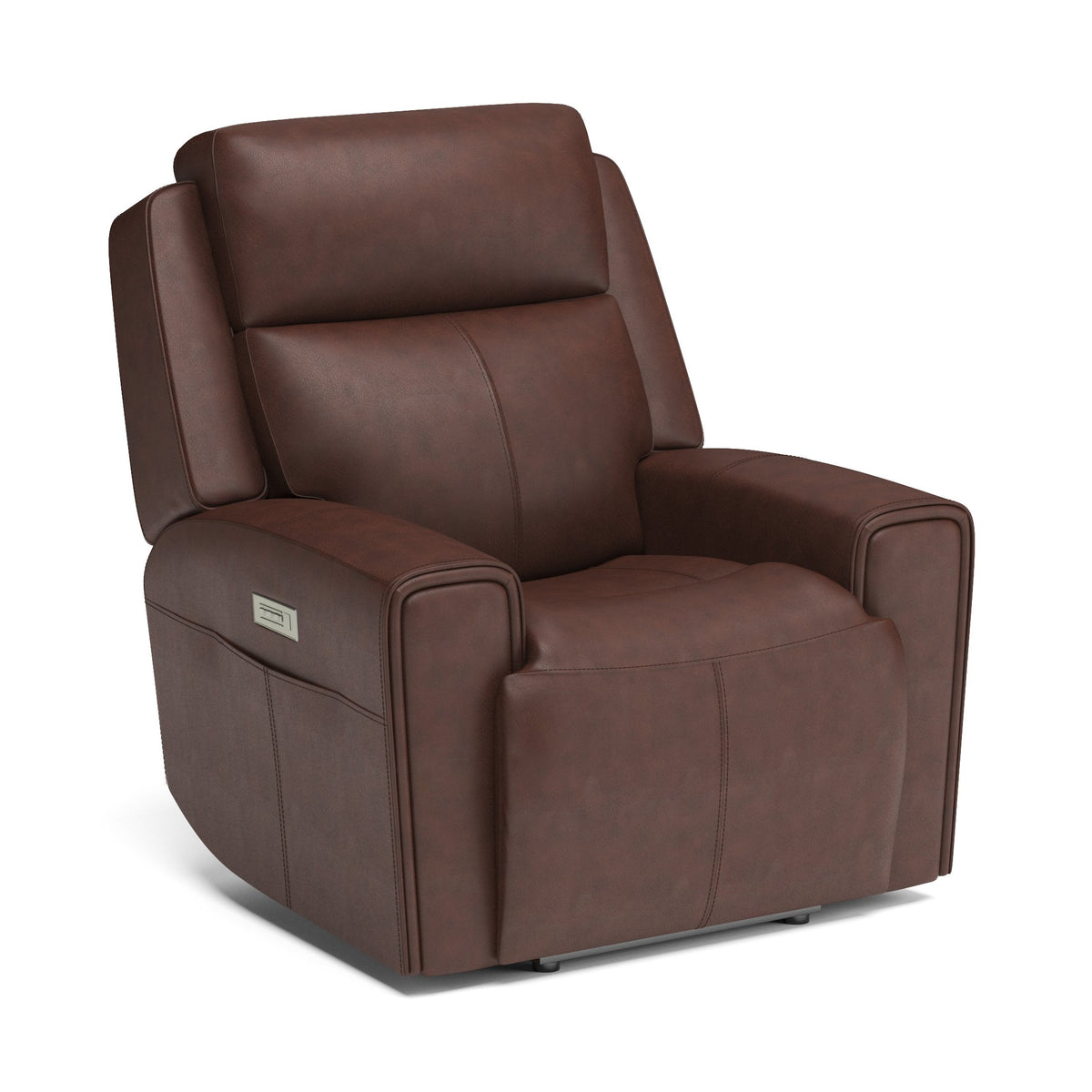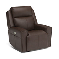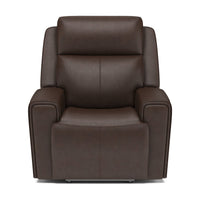 Recline into relaxation with the Barnett power recliner with power headrest and lumbar. As you lounge, our Zero Gravity recline technology cradles your body and gives you a feeling of weightlessness. Dial in your perfect level of comfort with a power control that independently adjusts the recline, headrest and lumbar for extra back support. For your convenience, the recliner features a USB charging port built into the power control to keep devices charged and a handy side pocket for storing remotes. A waterfall chaise takes pressure off tired legs, while a wide, contoured seat allows you to sit comfortably for as long as you like. Our patented Flexsteel DualFlex Spring System™ provides a pleasing mix of firmness and flexibility as you sit. And thoughtful enhancements, including wide track arms with durable top-stitching and attractive welt trim, give this recliner an elevated look. Finished in our premium top-grain leather, this recliner is sure to look good for years to come.
