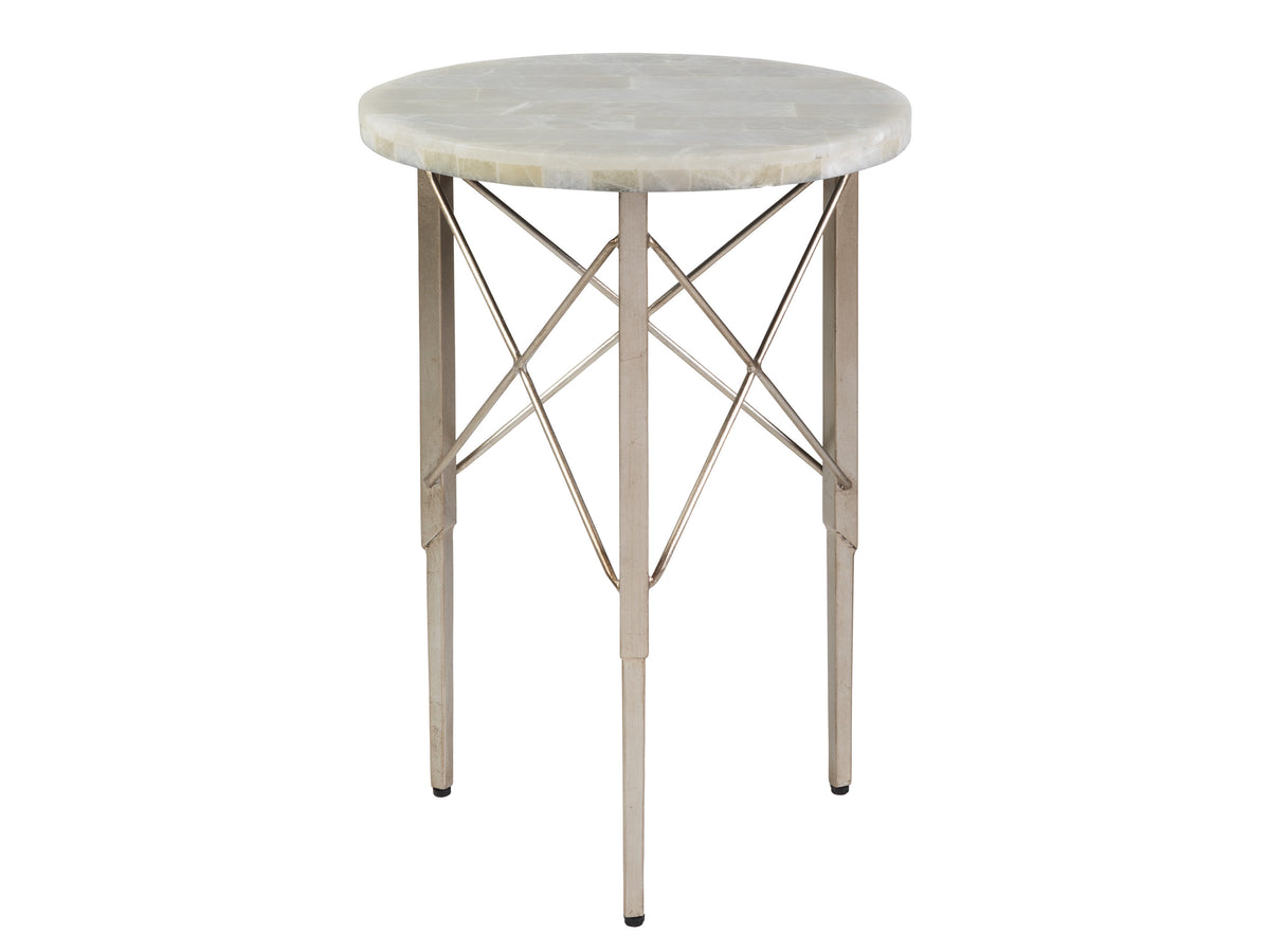 Transitional design with honed White Onyx top and iron base with tapered legs and decorative stretcher in a champagne leaf finish.