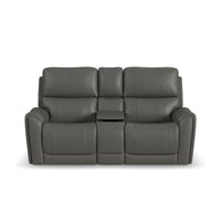 Power up and enjoy secretive perks with the Carter power reclining loveseat with console. This piece features triple power and our Zero Gravity mechanism, allowing you to customize the recline, headrest and lumbar support on both seats, including reclining to a zero-gravity position for the ultimate comfort experience. This loveseat will be a statement in your home with its genuine leather look that is a durable, easy to clean fabric in two color choices. Flared arms, contoured seats and heavy thread stitching details give it a sleek, yet striking look. And it all comes with discreet storage perks, including pop-out cupholders in the arms and a center storage console and a wireless charging pad.