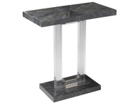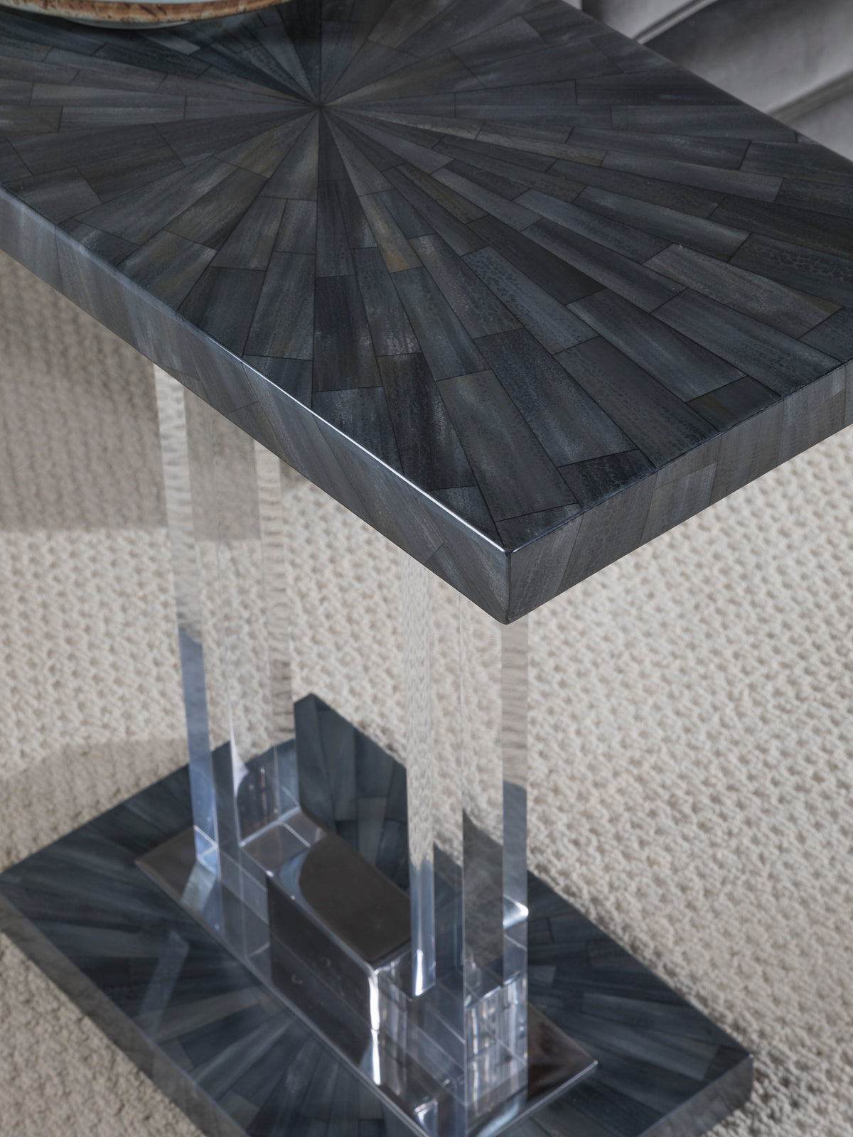 Neoclassical original design in select hardwoods, with faux horn top and base in a dusky gray coloration, inlaid in an elliptical starburst pattern on acrylic posts clasped in stainless steel.