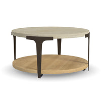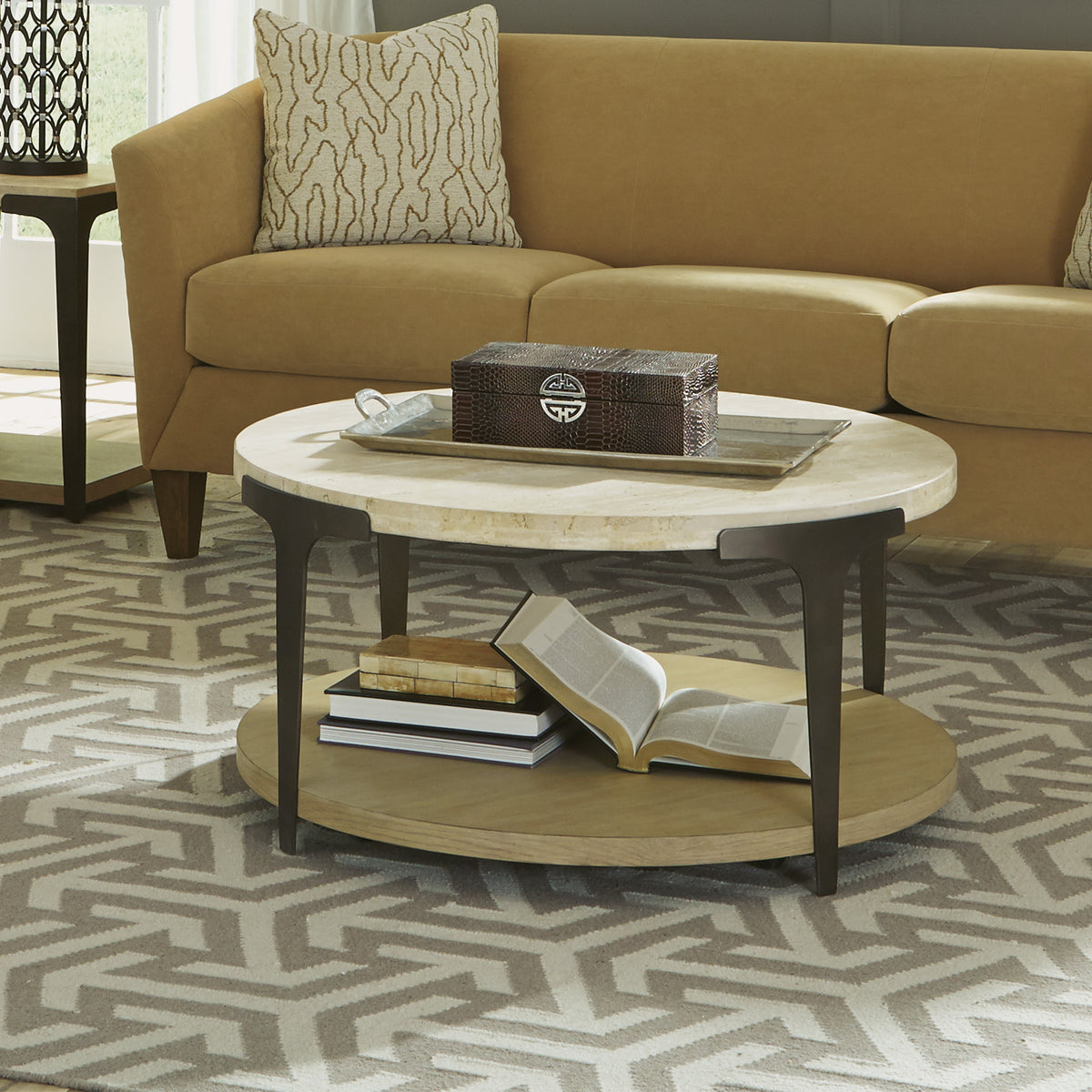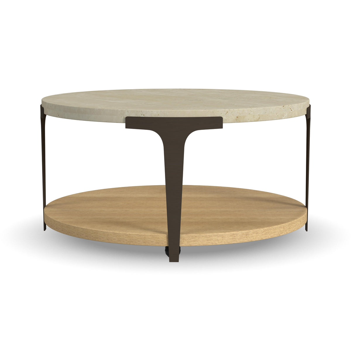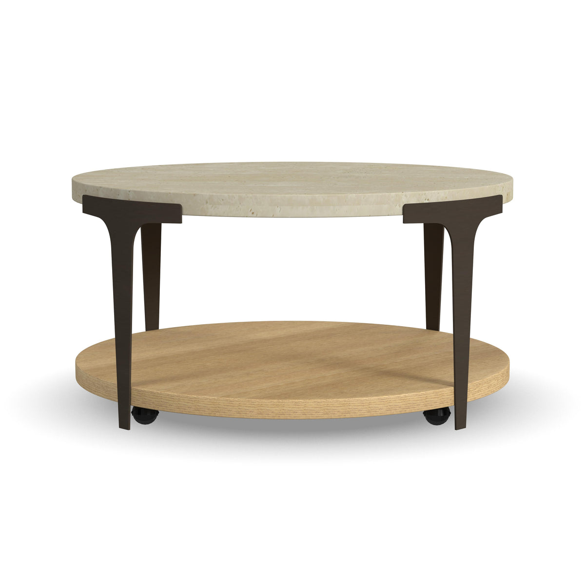 Timeless materials make a statement of style in modern to traditional spaces. The Omni Coffee Table with Casters features a stunning travertine stone surface, polished to reveal its natural pores. A lower oak shelf is perfect for additional storage or display. Dark metal legs offer an eye-catching contrast. This table is right at home in the family room, but hidden casters make it easy to move around the home when entertaining.