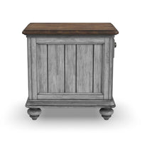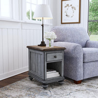 Bring cottage-inspired style to living spaces with the charming and useful Plymouth chairside table. A weathered graywash finish is contrasted by a medium brown planked top, while detailed molding and turned bun feet add to the cozy vintage character. A single drawer on ball-bearing glides and open compartment provide convenient storage for anything needed to be kept within reach. The table’s small-scale design makes it a perfect accent piece for any size room.